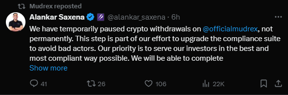 “Tebrikler! Mudrex kripto para çekimlerini durdurdu! Daha önce sizi uyarmıştım, hatırlayın. Eğer hâlâ paranızı çekmediyseniz, INR’ye çevirip hemen bankanıza aktarın ve uzaklaşın!”