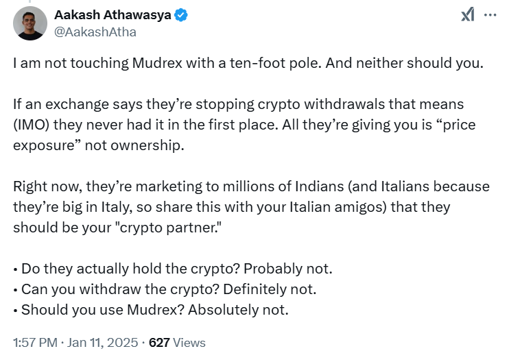 Başka bir kullanıcı olan Aakash Athawasya ise Mudrex’in “kripto para çekimlerini aslında hiç sunmadığını” iddia etti. Bu hizmetin “fiyat maruziyeti, ancak sahiplik sağlamadığı” şeklinde yorumladı. Mudrex’e asla güvenmeyeceğini belirterek sert bir eleştiri yaptı.