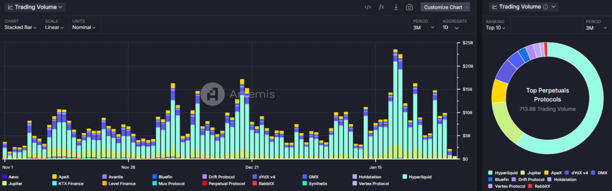 Veriler, Hyperliquid’in vadeli işlem piyasasında işlem hacmi açısından lider konumda olduğunu gösteriyor. Artemis tarafından sağlanan bilgilere göre son üç ayda en iyi 10 protokolde toplam 713,8 milyar dolarlık işlem hacmi gerçekleşti. Bu hacmin 419,1 milyar doları, yani yüzde 59,6’sı Hyperliquid tarafından sağlandı.