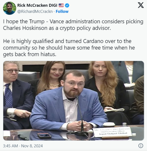 Cardano’nun kurucusu Charles Hoskinson, Donald Trump’ın kripto danışmanı rolü için en iyi aday olarak gösteriliyor. Bir Stake Pool Operatörü olan Rick McCracken, Charles Hoskinson’ın Trump-Vance yönetimi altında kripto politikasının şekillendirilmesinde kilit bir rol oynayabileceğini öne sürerek X’teki vızıltıyı başlattı. McCracken, Hoskinson’ı bu iş için en uygun kişi olarak işaret etti. Bu bağlamda, Hoskinson’un kripto endüstrisine yaptığı büyük katkılardan bahsetti. McCracken, Trump’ın kripto işlerini denetlemek için Hoskinson’ı tercih ettiğini ima etti.