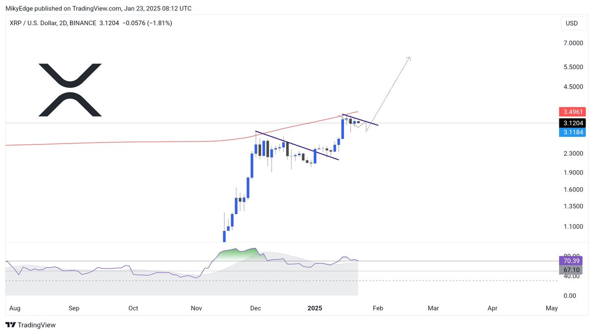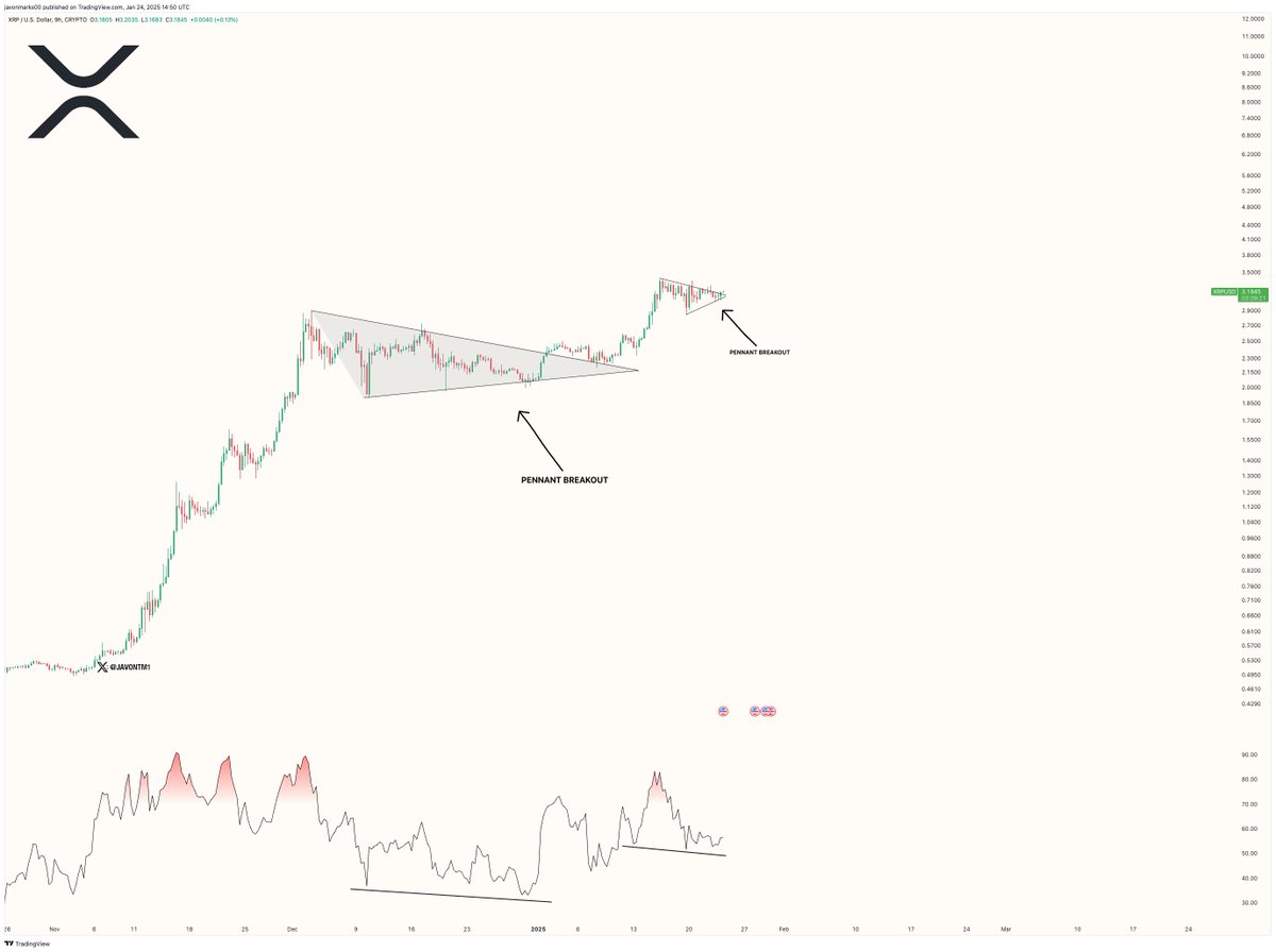 Marks’ın paylaştığı grafikte, XRP’nin 3.18 direnç seviyesinden bir boğa flaması formasyonu kırılımı yaşadığı görülmekte. Geçen yılın sonunda XRP, benzer bir kırılmanın ardından önemli bir yükseliş yaşadı. Bu nedenle analist, teknik analizin bu kez de yükseliş ihtimaline işaret ettiğini dile getirdi.