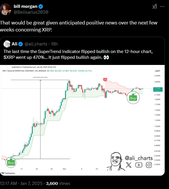 XRP’nin gelecek haftalarda olumlu gelişmeler yaşaması beklenmekte. Ripple avukatlarından Bill Morgan’da bu konuda oldukça iyimser açıklamalar yaptı. Morgan, önde gelen piyasa analisti Ali Martinez’in son analizlerinin desteklediğini ifade etti. Martinez, sosyal medya platformu X’te yaptığı paylaşımda, XRP fiyatlarının 12 saatlik grafik üzerinde “SuperTrend” göstergesinin yeniden pozitif sinyale geçtiğini vurguladı.