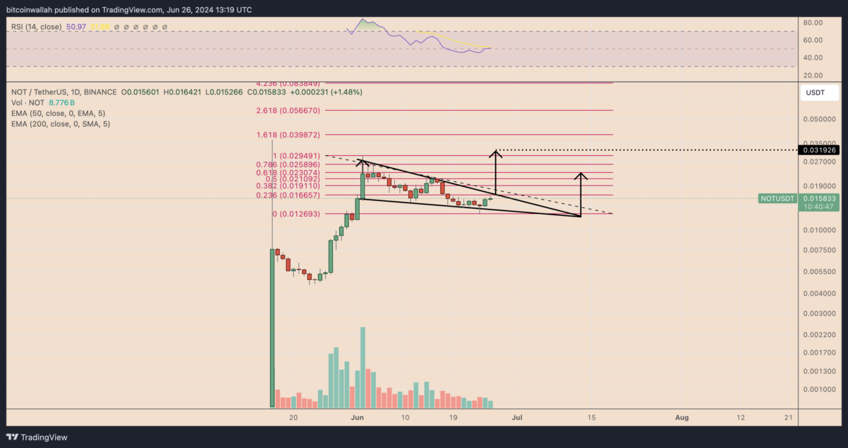 Kriptokoin.com’dan takip ettiğiniz üzere Notcoin ekibi 25 Haziran’da bir günde 3 milyon dolar değerinde 210 milyon NOT tokenı yaktığını duyurdu. Bu da traderların dikkatini çekti. Dolayısıyla bu hamle, altcoin fiyatının %16,40’a varan bir artışla 0,0164 dolara ulaşmasına yardımcı oldu. Fiyat grafiği teknikleri, NOT’un devam eden fiyat rallisinin, token’ın hakim düşen kama formasyonunun alt trend çizgisini test etmesinin ardından daha geniş bir toparlanmanın parçası olduğunu gösteriyor.