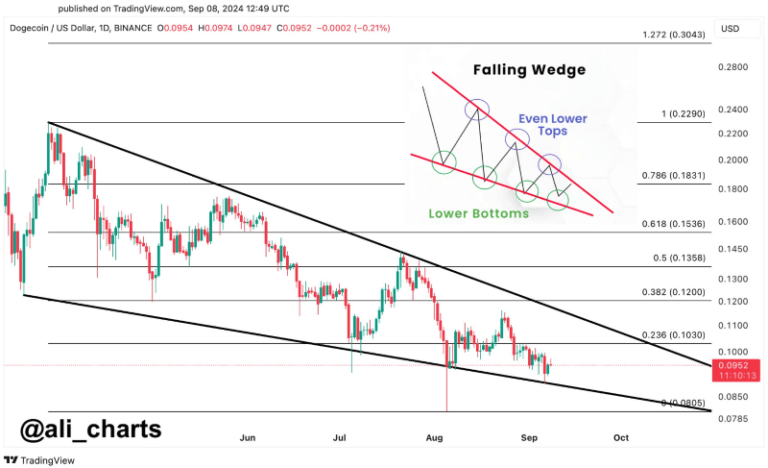 Kriptokoin.com’dan takip ettiğiniz üzere, piyasa toparlanma işaretleri gösterse de ilerlemekte zorlanıyor. Popüler analist Ali Martinez’in analizine göre, Dogecoin’in fiyatı Mart ayından bu yana günlük grafiğinde düşen bir kama formasyonu sergiliyor. Analist, 0,10 doların üzerinde sürekli bir kapanışın, 0,15 dolara doğru bir yükselişi tetikleyeceğini söylüyor.