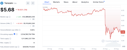 Kaynak: PolymarketDurov’un tutuklanması kripto piyasasında, özellikle Toncoin (TON) ve Notcoin’i (NOT) etkileyen bir heyecan yarattı. Çünkü, bu altcoin projeleri Telegram ile yakından bağlantılı. Ayrıca, böylesine yüksek profilli bir kişinin tutuklanması anlaşılır bir şekilde yatırımcı güvenini sarsarak fiyat düşüşlerine yol açtı. Durov’un tutuklanmasının ardından Toncoin’in fiyatı sert düştü. 19 Ağustos ve 24 Ağustos arasında, 6,50 ila 6,75 dolar arasında seyrederek oldukça sabit kaldı. Ancak, 25 Ağustos’ta fiyat 6,75 dolar civarından yaklaşık 5,50 dolara düştü. Bu keskin düşüş, haberlere cevaben önemli bir satış yapıldığına işaret ediyor.