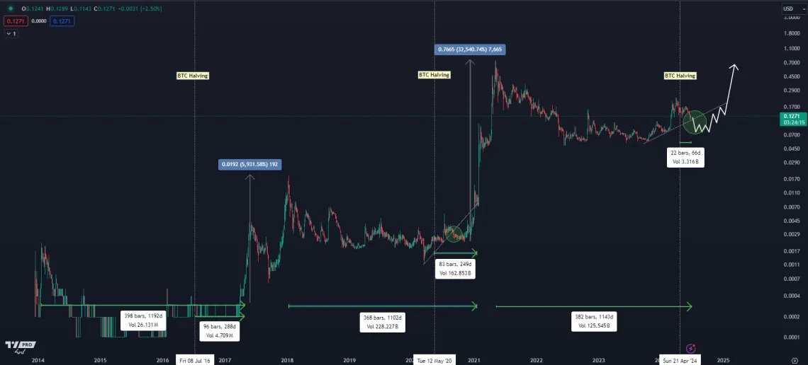 Bu hareketlerin her biri (önceki DOGE rallileri), Bitcoin halving’inden sonra pompalanmaya başlamadan önce yaklaşık sekiz ila dokuz ay sürdü. Şu anda en son Bitcoin halving’inin üzerinden sadece iki ay geçmiş durumda. Bunu akılda tutarak, gerçek bir kırılma/genişleme hareketinin Aralık – Şubat aylarına kadar gerçekleşmemesi aslında trende daha uygun olacaktır.