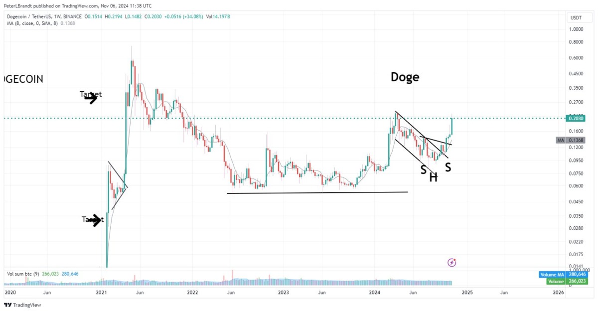 Kriptokoin.com’dan takip ettiğiniz üzere, piyasada Donald Trump’ın zaferinin rüzgarı esiyor. Özellikle güçlü bir Trump destekçisi olan Elon Musk’ın hayranlığını kazanmış olan Dogecoin piyasanın odağında. Meme coin, bugün 0,20 doların üzerine çıkmayı başardı. Bununla birlikte, analistler DOGE’den daha fazlasını bekliyor. Popüler kripto analisti Ali Martinez, Dogecoin fiyatının önümüzdeki günlerde 4 dolara ulaşmaya hazır olduğunu söylüyor. Ayrıca, DOGE fiyatındaki daha güçlü ralliler konusundaki cesur tahminiyle spekülasyonları da körüklüyor.