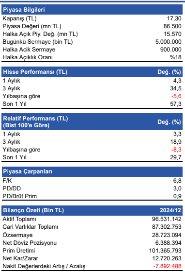 Sigorta sektöründe pazar liderliğini sürdüren Türkiye Sigorta, prim üretimindeki güçlü performansı ve teknik gelirlerin yanı sıra yatırım portföyünden elde ettiği gelirlerin katkısıyla 2024 yılını başarılı bir şekilde tamamladı. Şirket, istikrarlı finansal yönetimiyle sektör liderliğini pekiştirmeye devam etti. 2025 yılı için beklentimiz ise Merkez Bankası’nın faiz indirim sürecine rağmen faiz oranlarının yılın ilk yarısında alternatif yatırım araçlarına karşı cazibesini koruyacağı yönünde. Bu durum, şirketin yatırım portföyünden elde edeceği gelirleri desteklemeye devam ederken, faiz indirim sürecinin teknik karlılık üzerinde pozitif etkiler yaratacağını öngörmekteyiz. 16 Ocak 2025 tarihinde model portföyümüze dahil ettiğimiz Türkiye Sigorta için 23,8 TL hedef fiyatımızı koruyoruz.