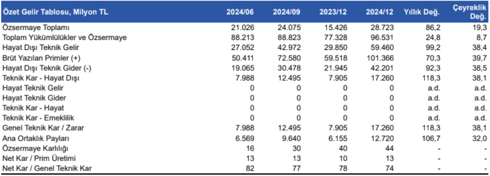 Şirket, 2024 yılında 17,3 milyar TL teknik kar elde etti ve bir önceki yılın aynı dönemine göre %118 artış gösterdi. Teknik kara Oto-dışı branş 17,2 milyar TL ve Sağlık Branşı 1,7 milyar TL katkı sağlarken Oto branşında 1,7 milyar TL teknik zarar yazıldı. Özellikle Kara Araçları Sorumluluk branşında 6,8 milyar TL zarar yazılması teknik karı baskılayan en önemli etken oldu.
