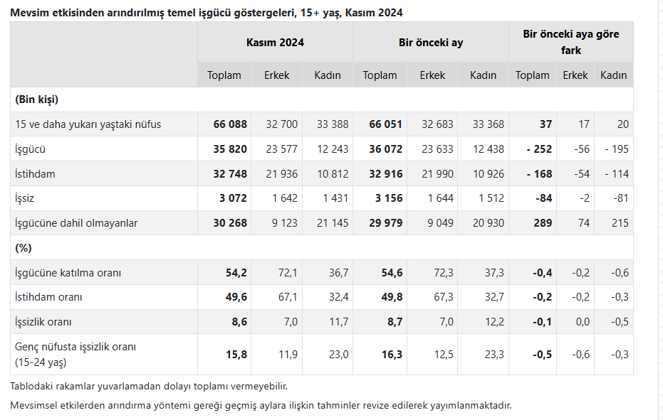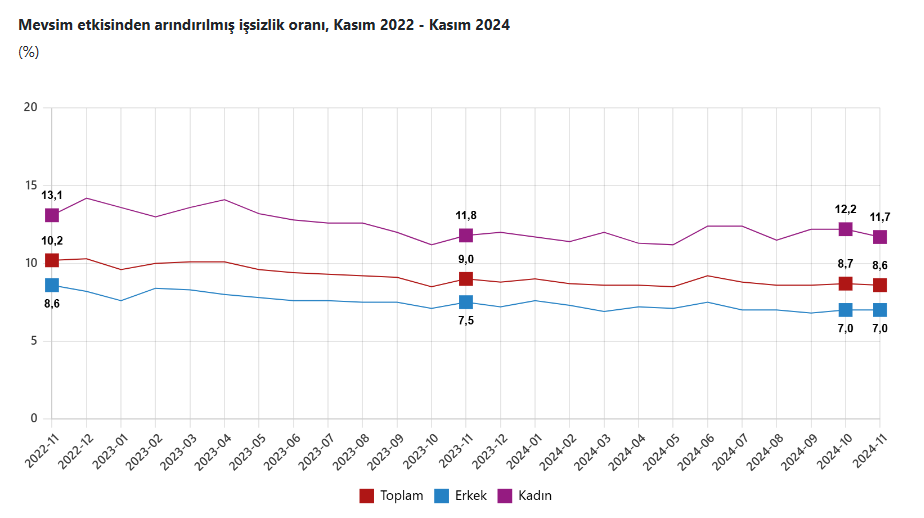 Hanehalkı İşgücü Araştırması sonuçlarına göre; 15 ve daha yukarı yaştaki kişilerde işsiz sayısı 2024 yılı Kasım ayında bir önceki aya göre 84 bin kişi azalarak 3 milyon 72 bin kişi oldu. İşsizlik oranı ise 0,1 puan azalarak %8,6 seviyesinde gerçekleşti. İşsizlik oranı erkeklerde %7,0 iken kadınlarda %11,7 olarak tahmin edildi.