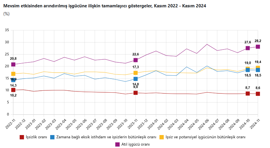 Zamana bağlı eksik istihdam, potansiyel işgücü ve işsizlerden oluşan atıl işgücü oranı 2024 yılı Kasım ayında bir önceki aya göre 0,6 puan artarak %28,2 oldu. Zamana bağlı eksik istihdam ve işsizlerin bütünleşik oranı %18,5 iken işsiz ve potansiyel işgücünün bütünleşik oranı %19,4 olarak tahmin edildi.