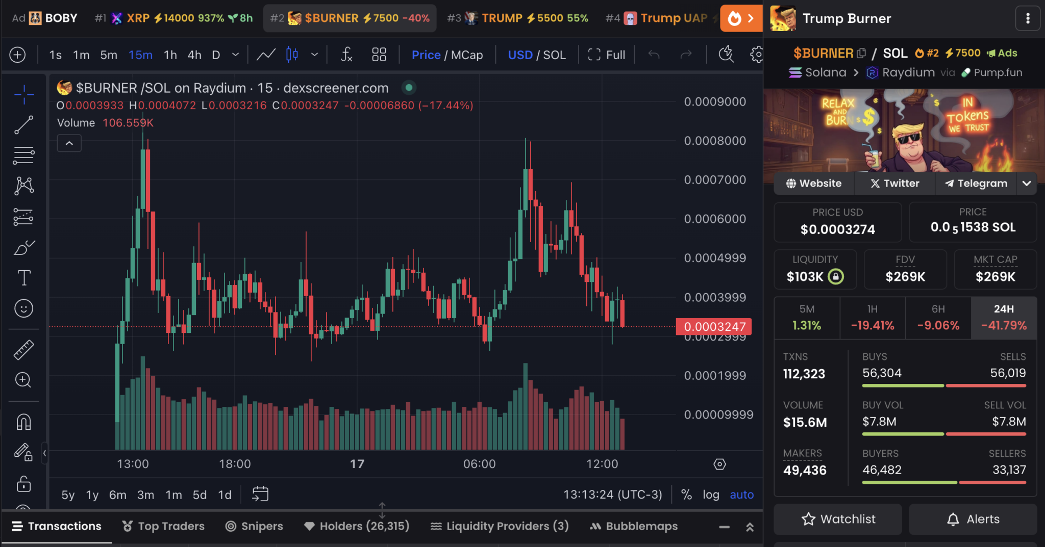 BURNER, yalnızca bir gün önce Solana’nın en büyük launchpad platformu Pump.fun üzerinde piyasaya sürüldü. Şimdiden 26.000’in üzerinde yatırımcı topladı ve günlük 15.6 milyon dolarlık işlem hacmiyle göz dolduruyor. Üstelik 112.000’den fazla işlem sayısına ulaştı. Bu token, Donald Trump’ın başkanlık yemin töreni etrafında şekillenen bir pazarlama stratejisi izliyor.