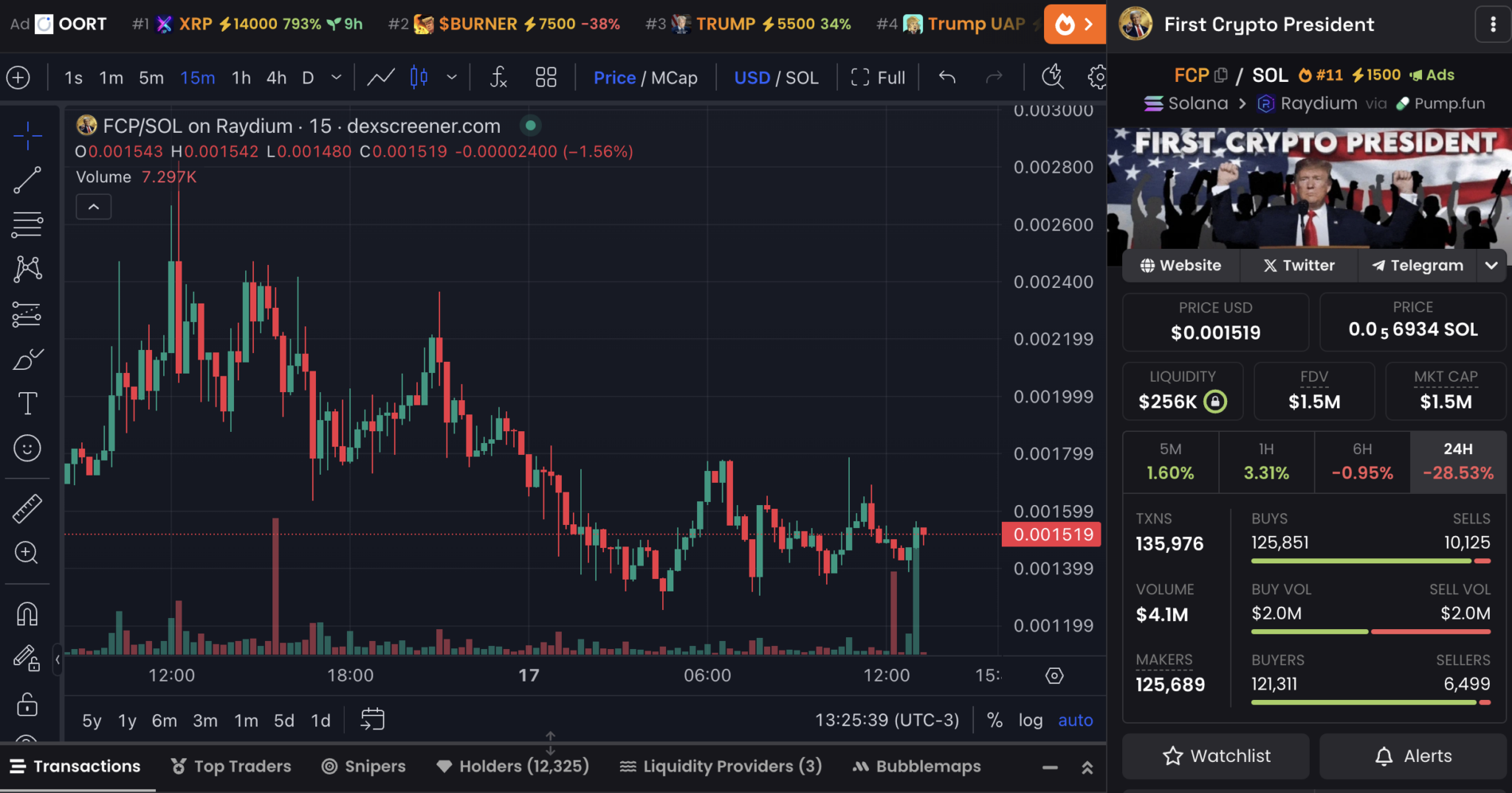 FCP, yine Trump’ın yemin töreni temasıyla ortaya çıkan bir başka proje. Üç buçuk gün önce Pump.fun üzerinde listelendi ve hızla 12.000 yatırımcıya ulaştı. Günlük 4.1 milyon dolarlık işlem hacmiyle de dikkat çekiyor. Şu anki piyasa değeri 1.5 milyon dolar seviyesinde. Ancak günlük 136.000’den fazla işlem gerçekleştiriliyor, bu da yatırımcı ilgisinin sürdüğünü gösteriyor.