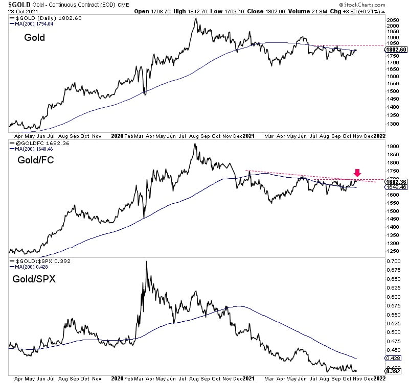 Kısa vadeli görünüme ilişkin ipuçları için, birkaç indikatöre göz atan analist aşağıdaki grafikte altın ile birlikte altını yabancı para birimlerine (Altın/YP) ve hisse senedi piyasasına karşı çiziyor. Altın/YP, önemli dönüm noktalarında altına liderlik etme eğilimindedir. YP, geçtiğimiz birkaç ay içinde altından daha iyi performans gösterdi, ancak analiste göre henüz önemli bir farklılık yok. Altın ise borsaya karşı inanılmaz derecede zayıf kalıyor. Analiste göre değerli metal 1.835 doların üzerine çıkacaksa bu değişmeli.