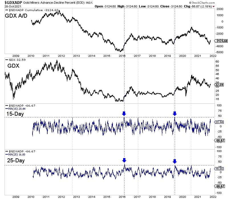 Genişlik, dipleri takiben meydana gelir, ancak bazen piyasa zirvelerinde de meydana gelebilir. Roy-Bryne, 15 günlük ve 25 günlük düşüşteki harekete ve 2016 ve 2019 diplerinden sonraki artışlara dikkat edilmesi gerektiğini belirtiyor. Analiste göre GDX’in bir veya iki hafta daha önemli bir güç gösterebilirse, 15 ve 25 günlük göstergeler, önemli bir dip noktasının kanıtı olabilecek geniş bir hamle sinyali verebilir.