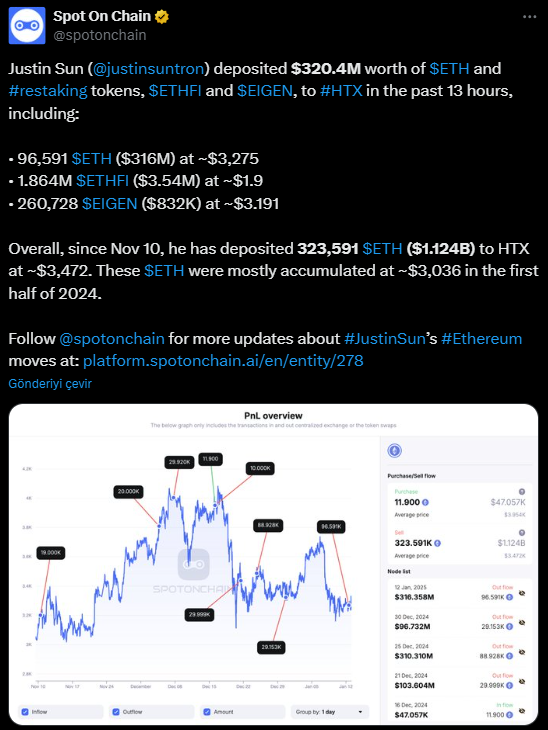 Spot Onchain tarafından paylaşılan verilere göre Justin Sun, 13 saat içinde HTX üzerinde 320,4 milyon dolar değerinde ETH ve restaking token taşıdı. İşlem detayları arasında 96.591 ETH (yaklaşık 316 milyon dolar değerinde), 1,864 milyon ether.fi (ETHFI) token (yaklaşık 3,54 milyon dolar değerinde) ve 260.728 EIGEN token (yaklaşık 832 bin dolar değerinde) yer aldı. Sun, Ether’i ETH başına ortalama 3.275 dolarlık fiyattan yatırdı ve bu da daha önceki birikim fiyatlarına (3.036 dolar) göre bir primi yansıtıyor. Bu, Justin Sun’ın ticaret fırsatlarını göz önünde tutmak için yaptığı taktiksel bir hareket olabilir.