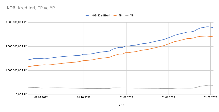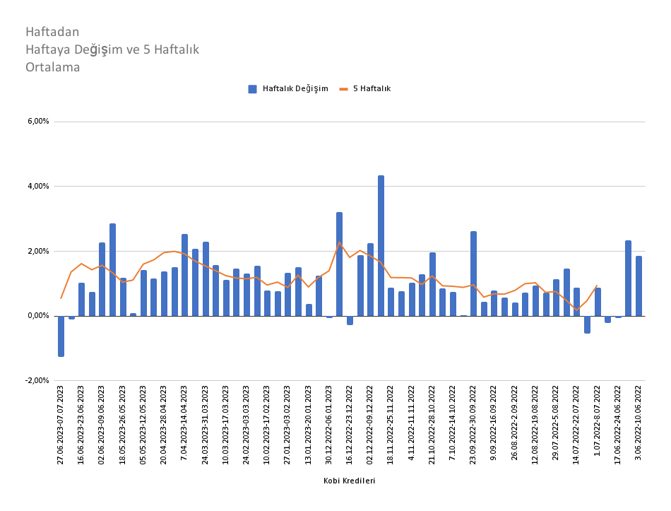 Yayımlanan verilere göre 27 Haziran haftasında gerileyen KOBİ kredileri, 7 Temmuz haftasında da daralmaya devam etti. 27.07.2023 ile 07.07.2023 tarihleri arasında bankacılık sektörünün KOBİ’lere verdiği toplam kredilerde yüzde 1,26 daralma gözlemlendi.