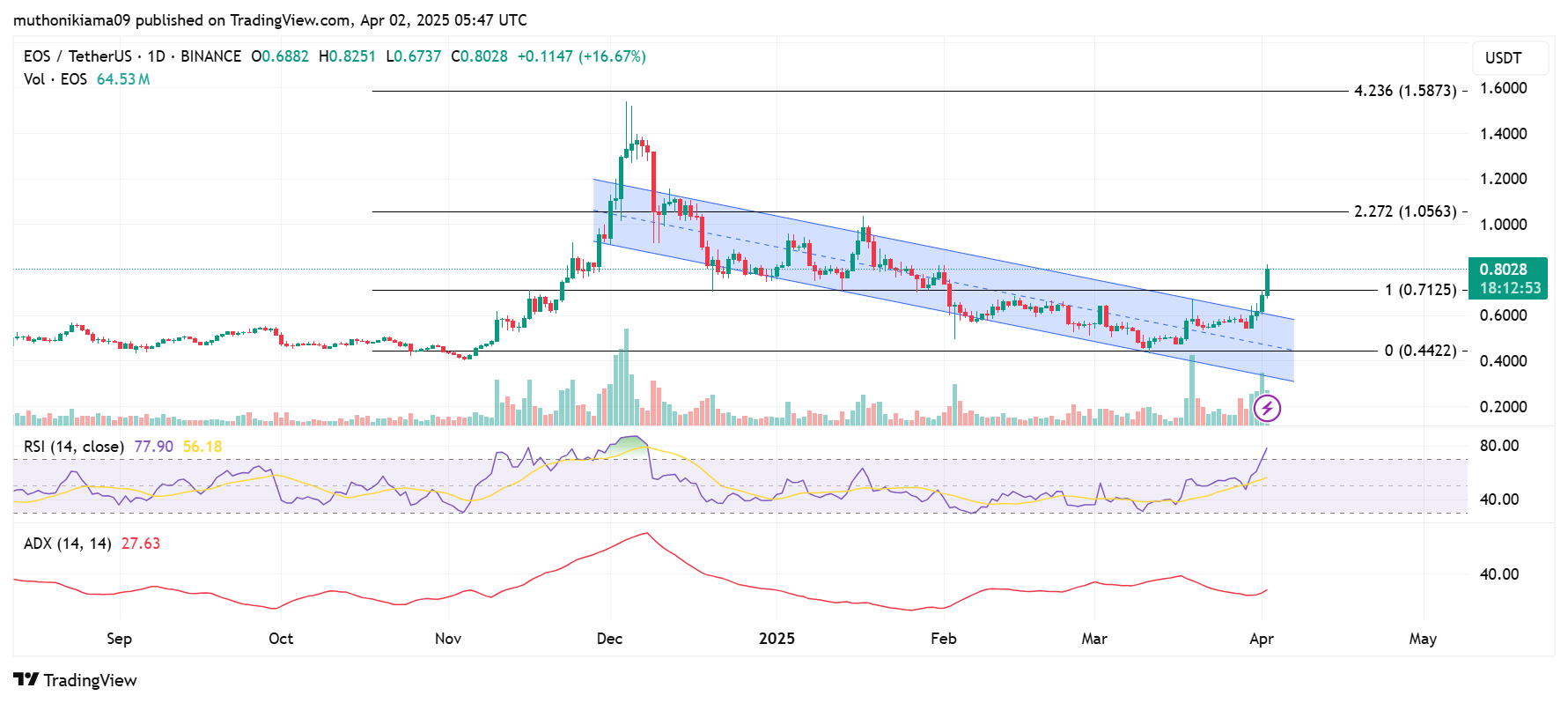 Göreceli Güc Göstergesi (RSI) 77 seviyesinde bulunuyor. Bu, EOS’un aşırı alım bölgesine yaklaştığını ve kısa vadeli bir düzeltme yaşanabileceğini gösterebilir. Ancak, Yönelimli Hareket Endeksi (ADX) değerinin artması, boğa momentumunun güçlendiğini işaret ediyor. Bu teknik sinyaller, EOS fiyatının yükseliş için daha fazla alanı olduğuna işaret ediyor. Uzmanlar, fiyatın %227.2 Fibonacci seviyesine denk gelen 1.05 doları görebileceğini öngörüyor.