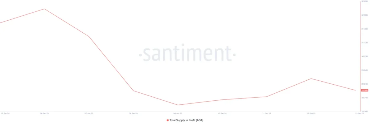 Santiment tarafından sağlanan verilere göre, son bir hafta içinde Cardano’nun kârda bulunan toplam arzı 3.55 milyar ADA azaldı. Şu an itibarıyla, toplamda 42.56 milyar olan arzın yalnızca 29.06 milyar ADA’sı kârda. Bu durum, birçok yatırımcının artık ADA yatırımlarında zararda olduğunu gösteriyor. Yatırımcıların artan satış baskısı ve piyasa duyarlılığındaki zayıflama, fiyatların daha da düşme riskini artırıyor.