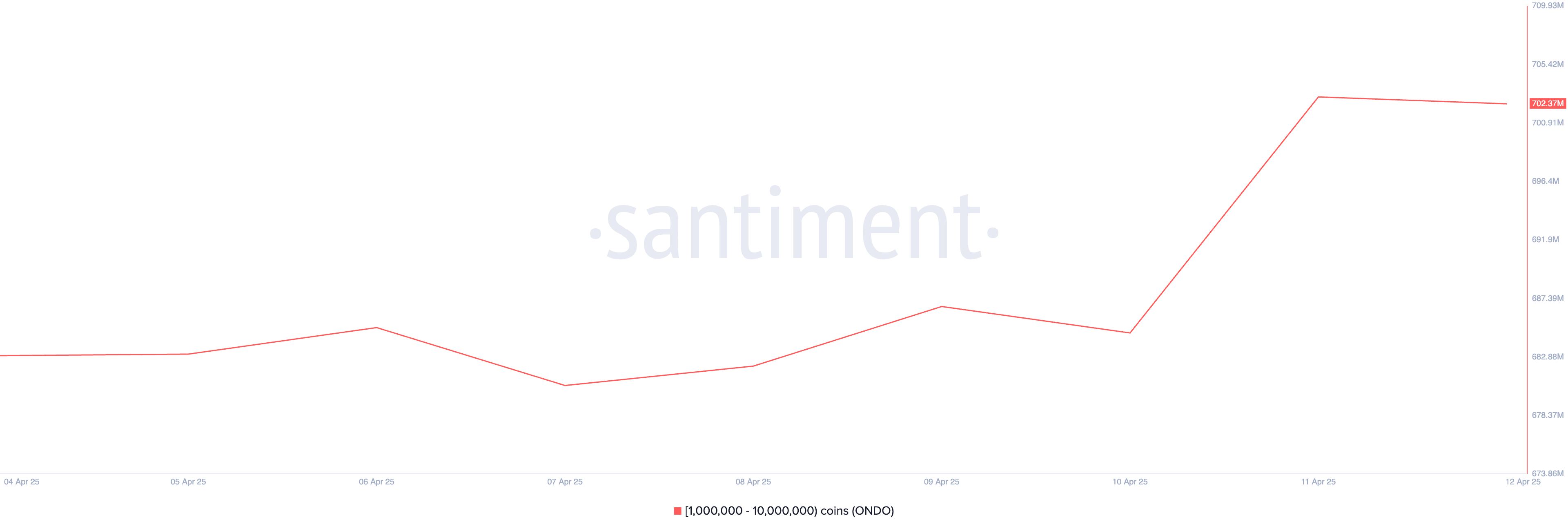 RWA (gerçek dünya varlığı) tabanlı token ONDO da bu haftanın balina ilgisi gören coin’leri arasında. 1 milyon ile 10 milyon ONDO tutan adresler, yedi günde 19.41 milyon adet ONDO satın aldı. Bu alımın toplam değeri yaklaşık 17 milyon dolar.