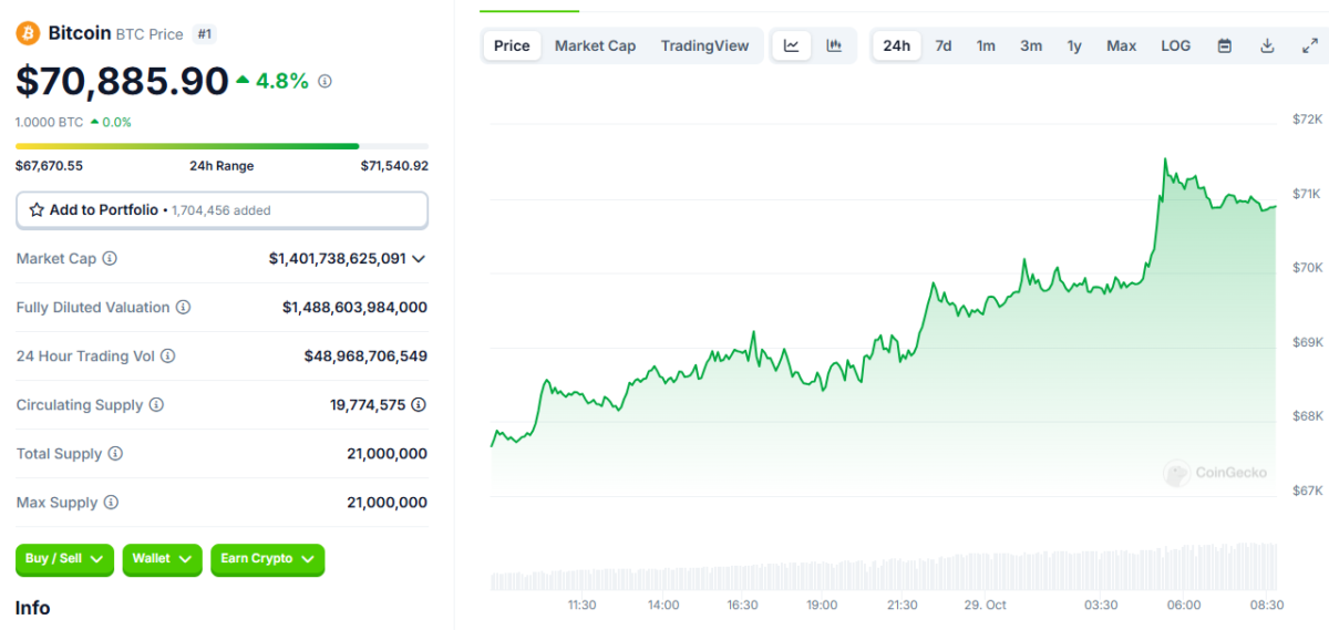 Bitcoin, son 24 saatte yaklaşık %5 artarak 71.036 dolara kadar yükseldi. Böylelikle gün içi en düşük ve en yüksek seviyeler sırasıyla 67.535,13 dolar ve 71.475,47 dolar olarak kayıtlara geçti. Ayrıca, bugün 479,35 milyon dolarlık spot Bitcoin ETF girişi dikkat çekiyor. Bitcoin’in piyasa değeri 1,4 trilyon dolara ulatı. Piyasa hakimiyeti ise %58,52’ye çıkarak %0,31 oranında bir artış yaşandı.