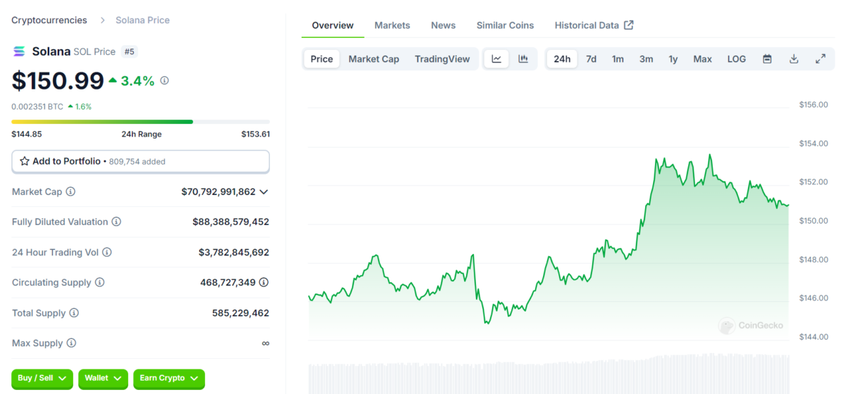 Solana (SOL), son 24 saat içinde %4 değer kazanarak 152 dolara ulaştı. Gün içindeki en düşük fiyat 144 dolar, en yüksek fiyat ise 153 dolar oldu. Kripto para biriminin piyasa değeri şu anda 71,19 milyar dolar seviyesinde. Solana, hız ve düşük işlem maliyetleriyle dikkat çekiyor. Bu da yatırımcıların ilgisini canlı tutuyor. Son dönemdeki genel piyasa yükselişi ile birlikte Solana da güçlü bir ivme kazandı.