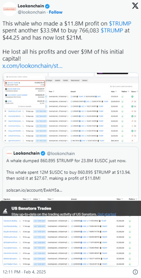 Bir kripto para traderı TRUMP memecoin ile 11 milyon doların üzerinde kara ulaştı. Ancak, daha sonra piyasa çöküşü sırasında 21 milyon dolardan fazla zarar ederek hepsini geri verdi.