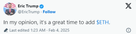 Ardından Donald Trump, piyasanın olumlu tepki verdiği Kanada ve Meksika tarifelerini beklemeye aldı. Bunun ardından, ekibi 4 Şubat’ta ABD’nin kripto stratejik rezervi hakkında konuşmak üzere bir basın toplantısı düzenleyeceğini duyurdu. Daha sonra Başkan’ın oğlu Eric Trump’tan ETH üzerine yükseliş mesajları geldi.