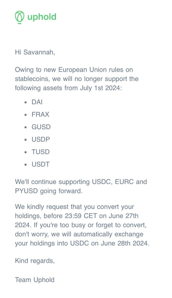Kripto para borsası Uphold, Avrupalı kullanıcılarına, platformun 1 Temmuz’dan itibaren altı popüler stablecoin desteğini sonlandıracağını bildiren bir bildirim gönderdi. Kripto borsaları, Kripto Varlık Piyasaları (MiCA) yeni stablecoin çerçevesi adı verilen Avrupa kripto düzenlemelerine uyum sağlamak için bu stablecoinleri listeden çıkarıyor.