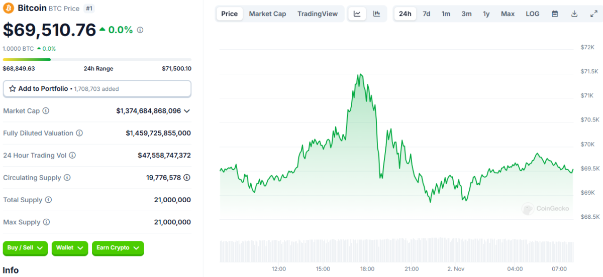Bitcoin, son 24 saat içinde %0,5’lik hafif bir yükselişle 69.675 dolara ulaştı. Gün içindeki en düşük ve en yüksek değerleri 68.803,31 dolar ile 71.559,02 dolar arasında değişti. Ayrıca BTC’nin piyasa değeri 1,38 trilyon dolara yükseldi ve piyasa hakimiyeti %0,10 artış göstererek %58,94’e çıktı. Sosovalue verilerine göre, 1 Kasım’da spot Bitcoin ETF’lerinden 54,94 milyon dolarlık çıkış oldu. BTC fiyatındaki dalgalanmalar yatırımcıları endişelendiriyor. Ancak olumlu bir senaryo, fiyatın 73.750 dolara kadar çıkmasına yol açacak. Öte yandan, işler tersine dönerse kripto 66.000 dolara kadar düşebilir.