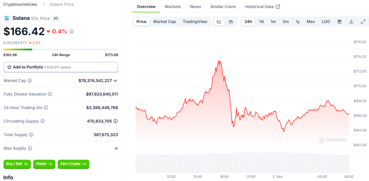 Solana (SOL), oldukça hareketli bir 24 saat geçirdi ve şu anda 167 dolardan işlem görüyor. Ayrıca gün içindeki en düşük ve en yüksek fiyatları 164,03 dolar ve 173,85 dolar olarak kaydedildi. Solana’nın piyasa değeri ise 78,6 milyar dolarda sabit kaldı. Kripto para kasım ayında 200 dolar seviyesini zorlayabilir.