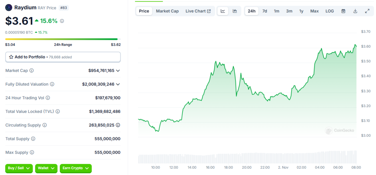 Raydium (RAY), son 24 saatte %15’ten fazla değer kazanarak 3,56 dolara çıktı. Gün içindeki en düşük ve en yüksek fiyatları 3,02 dolar ile 3,59 dolar arasında değişti. Cardano (ADA), %6’lık bir artışla 0,3619 dolara yükseldi. Monero (XMR) da %5 oranında artışla 159 dolardan işlem gördü.