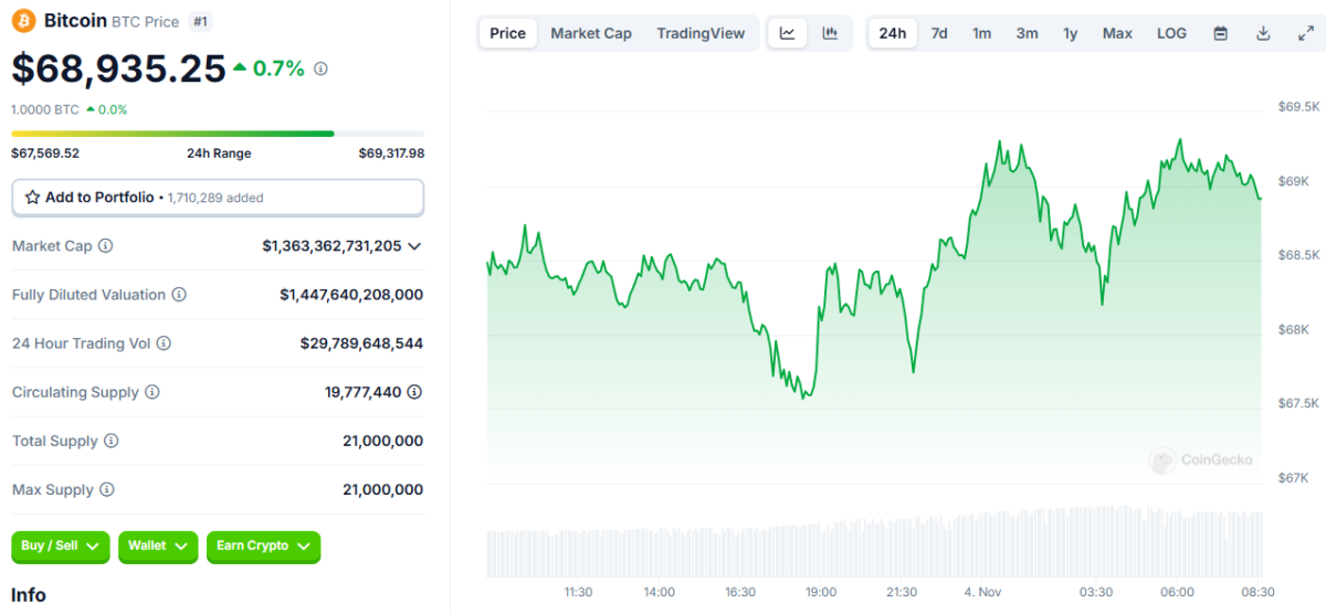 Bitcoin (BTC), son 24 saatte %1 civarında değer kazanarak 69.122 dolara ulaştı. İlk olarak, gün içindeki en düşük ve en yüksek seviyeler 67.482,53 dolar ve 69.433,18 dolar arasında değişti. Bitcoin’in piyasa değeri bugün 1,37 trilyon dolara yükseldi. Ayrıca, BTC’nin piyasa hakimiyeti dünden bu yana %0.33 artarak %59.32’ye çıktı. Bu yükseliş, Sosovalue verilerine göre geçen hafta spot Bitcoin ETF’lerine 2,22 milyar dolarlık girişlerle desteklendi. Üstelik, Whale Alert verileri, son 24 saatte büyük bir Bitcoin birikimi yapıldığını gösteriyor. Sonuç olarak, bu durum BTC’nin geleceği hakkında olumlu beklentileri daha da artırdı.