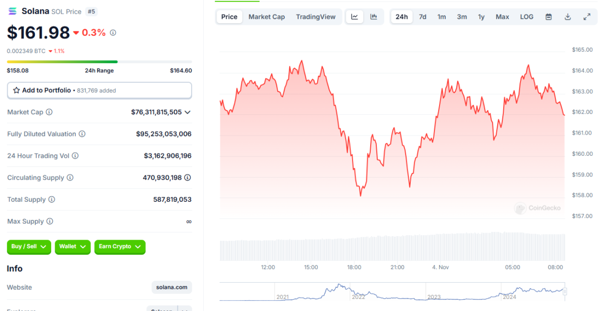 Solana (SOL) son 24 saatte yaklaşık %0.3’lük bir düşüşle 161,98 dolardan işlem görüyor. Öncelikle, coin’in gün içindeki en düşük ve en yüksek seviyeleri 158,14 dolar ve 164,71 dolar arasında seyretti. Bunun yanı sıra, Solana’nın piyasa değeri ise bugün 76,68 milyar dolara ulaştı. Ayrıca, kripto paranın 24 saatlik işlem hacmi %31’lik bir artışla 2,52 milyar dolara çıktı.