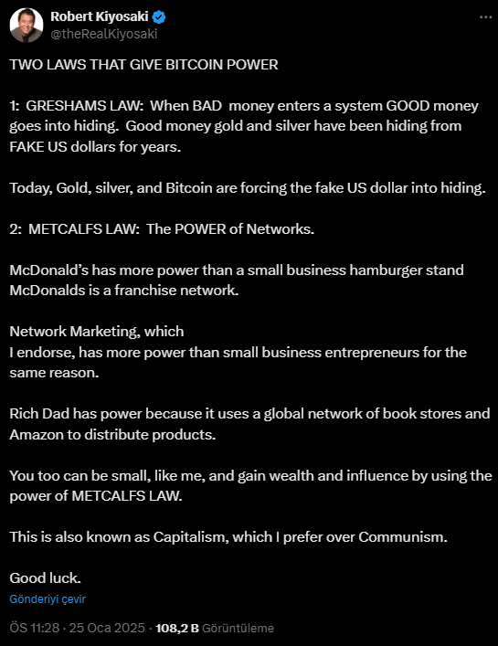 Amerikalı finansal analist ve çok satan Rich Dad Poor Dad kitabının yazarı Robert Kiyosaki, lider kripto para birimi Bitcoin’in ABD dolarından daha iyi olmasının iki nedenini özetledi. Yakın tarihli bir yazıda Kiyosaki, kripto ile ilgili olumlu görüşünü paylaştı ve görüşünü destekleyen temel ilkeler olarak Gresham Yasası ve Metcalfe Yasası’nı vurguladı.