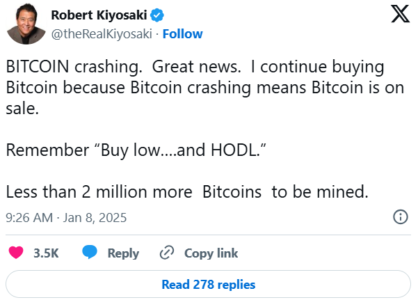 Çoğu yatırımcı endişeden tırnaklarını yerken, Kiyosaki alışveriş sepetini doldurmaya başlamıştı bile. Şimdiye kadar sadece 21 milyon coinin var olduğu ve 2 milyondan daha azının çıkarılacağı düşünüldüğünde, fiyattaki her düşüş, talebin bir gün azalan arzla çarpışacağına olan inancını pekiştiriyor. Yazarın tepkisi, duruşunu net bir şekilde ortaya koymak için X’te paylaşım yaptığında, oldukça keskindi: