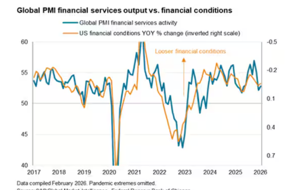 Hizmet sektöründeki yavaşlamanın merkezinde finansal hizmetler yer alıyor. Küresel finansal hizmetler PMI çıktı endeksi, aralık–ocak döneminde ortalama 52,5 seviyesinde kaldı. Bu oran, önceki altı ayda görülen 55,2 ortalamasının belirgin şekilde altında.