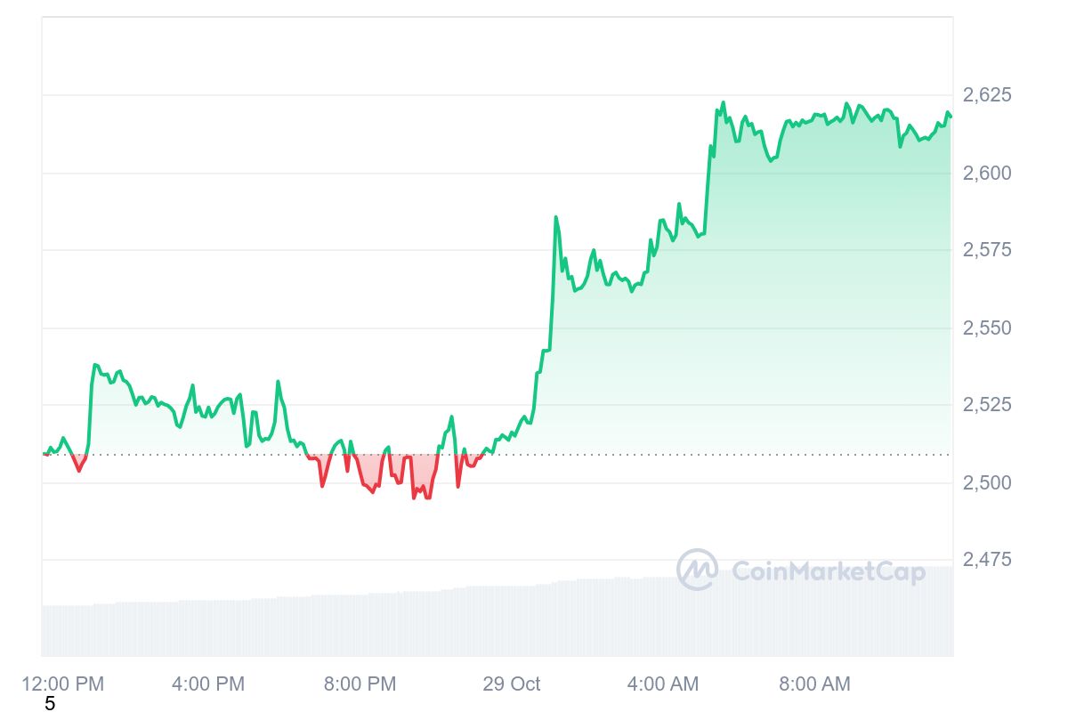 Vitalik Buterin’in duyurusu ve kripto piyasasında genel bir yükselişle birlikte Ethereum fiyatı yüzde 5.5 oranında artış göstererek 2,612 dolar seviyesine ulaştı. Bu esnada günlük işlem hacmi de yüzde 93 artarak 21.69 milyar dolara yükseldi.