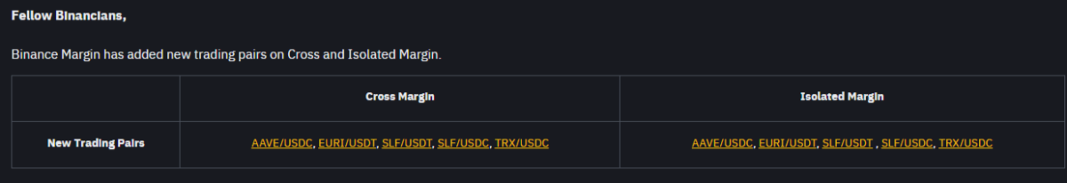 Kriptokoin.com’dan takip ettiğiniz üzere, bugün liste rüzgarı esiyor. Dev kripto borsası Binance, vadeli işlem platformu Binance Margin’e birkaç yeni işlem paritesi eklediğini duyurdu. Yeni listelenen altcoinler arasında AAVE Coin /USDC, EURI/USDT, SLF/USDT, SLF/USDC ve TRX/USDC yer alıyor. Bu hamle, platformun sunduklarını geliştirmeyi ve yatırımcılara portföy çeşitlendirme ve esnek alım satım stratejileri için daha fazla seçenek sunmayı amaçlıyor. Binance Margin, ürün tekliflerini sürekli olarak gözden geçirip genişletiyor. Böylece, kripto para ticareti topluluğunun gelişen ihtiyaçlarını karşılamayı amaçlıyor. Bu bağlamda kullanıcı deneyimini iyileştirmeye kararlı olduğunu gösteriyor.