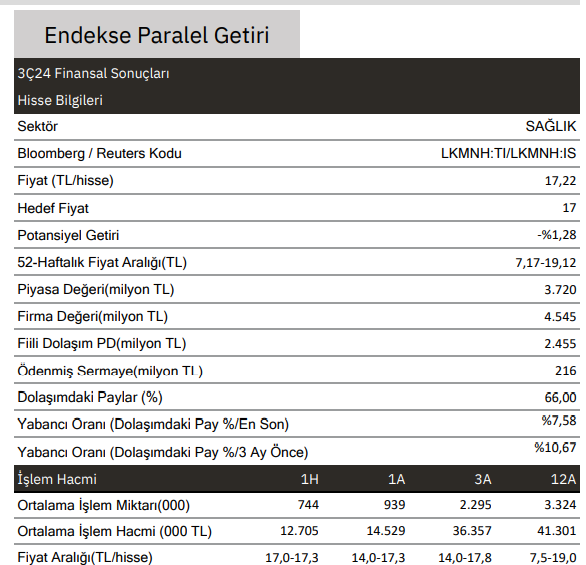 Şirket, 3Ç24’te 708 mn TL satış geliri (yıllık: +%8); 178 mn TL FAVÖK (yıllık: +%38) ve 10 mn TL net kar (3Ç23: -19 mn TL) açıklamıştır. Reel anlamda satış gelirleri, sağlık gelirlerindeki yatay büyüme, yüksek hayvancılık gelirleri (gelir kompozisyonu açısından hala düşük olmasına rağmen) ve yüksek lojistik gelirleri sayesinde %8 artışla 708 milyon TL’ye yükselmiştir. Şirketin brüt kar marjı 490bp’lık genişlemeyle %19,1 olarak gerçekleşmiştir. Böylelikle FAVÖK 3Ç24’te yıllık bazda %38 artmıştır (2Ç24: % 20,5, 3Ç23: %19,7).