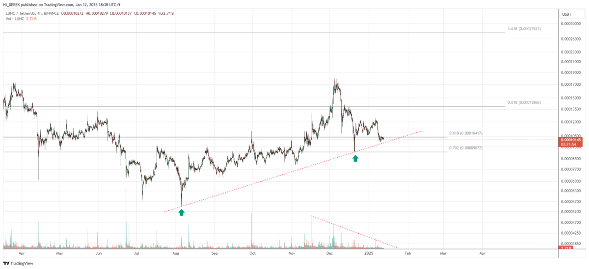 LUNC fiyatı, genel kripto para piyasasındaki düşüşle birlikte son bir haftada %15 değer kaybederek $0.0001022 seviyesine geriledi. Bununla birlikte, Fibonacci 0.618 seviyesinde seyreden fiyat, aşırı dalgalanma dönemine girme potansiyeli taşıyor.