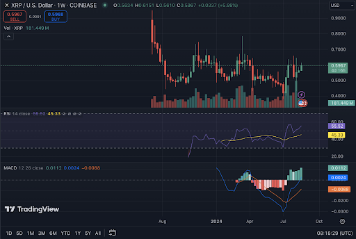XRP/USD 1 haftalık fiyat grafiği. Kaynak: TradingViewYazı sırasında XRP, 0,597080 dolardan işlem görüyor. Ancak, son zamanlarda %2,31 oranında düştü. Teknik analize göre, XRP fiyatlarında kısa vadeli yükseliş oluşumu olasılığı var. 1 haftalık RSI 55 seviyesinde. 60, yani piyasa nötr veya dengeli ve ayrıca sinyal çizgisinin üzerinde olan 1 haftalık MACD, hafif de olsa bir miktar pozitif momentuma işaret ediyor.