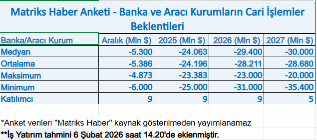 Ankette, 2026 yılı için cari açık beklentisi 29 milyar 400 milyon dolar açık yönünde gerçekleşti ve bir önceki anket dönemine göre açık beklentisinde artış yaşandığı görüldü. Ocak ayı Matriks Haber anketinde 2026 beklentisi 25 milyar 600 milyon dolar seviyesinde oluşmuştu.