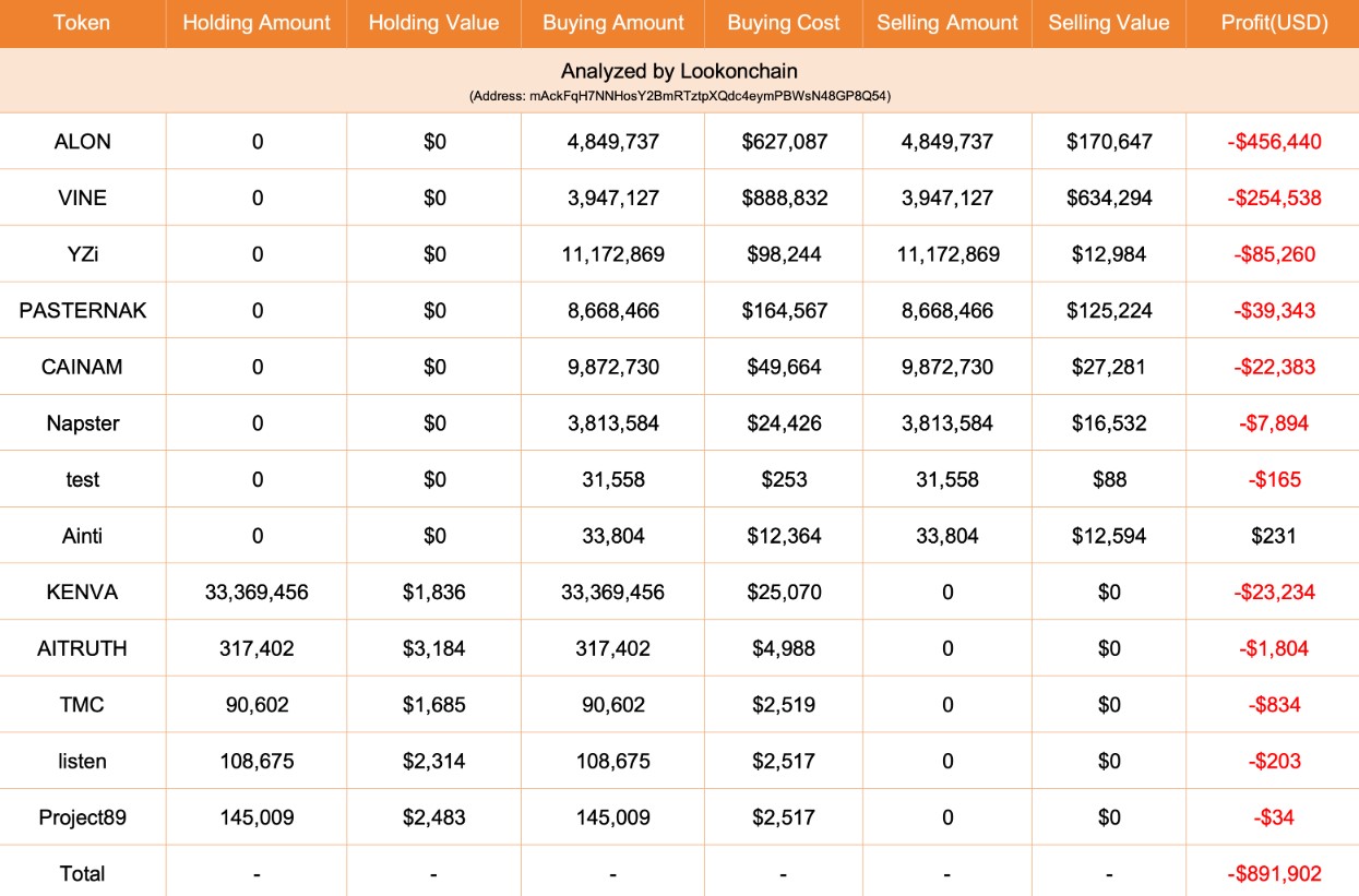 Yatırımcının yaptığı 13 işlemin yalnızca biri 231 dolar kâr sağladı. Alon (ALON) ve Vinecoin (VINE) token’lerinde sırasıyla 400.000 dolar ve 200.000 dolar zarar etti. Vinecoin, bir dönem popüler olan ancak artık kapanmış kısa video platformu Vine’ın kurucu ortağı Rus Yusupov tarafından başlatılmıştı.