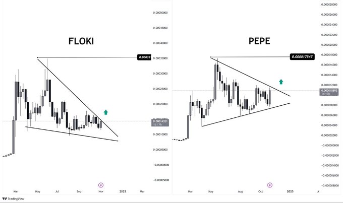 Kriptokoin.com olarak da bildirdiğimiz gibi, son dönemde memecoin piyasasında dikkat çekici bir hareketlilik yaşanıyor. PEPE ve FLOKI gibi popüler tokenler, yatırımcı ilgisini yeniden topluyor. Ayrıca İki token de grafiklerinde boğa bayrağı formasyonu oluşturdu. Bu teknik gösterge, genellikle yukarı yönlü bir hareketin habercisi olur. Bu durum, yeni bir ralli olasılığını artırıyor ve yatırımcıları harekete geçiriyor.