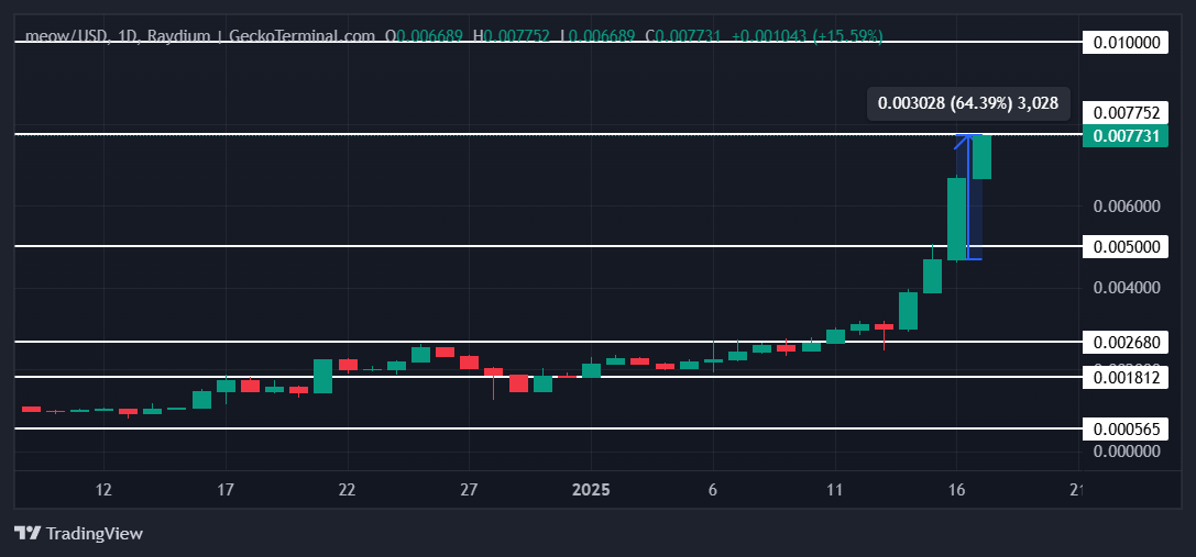 MEOW Coin, son 24 saat içinde %64 oranında yükselerek en iyi performans gösteren altcoinlerden biri oldu. Bu etkileyici yükseliş, fiyatı 0,0050 doların altından 0,0077 dolara çıkararak piyasada öne çıkmasını sağladı. Bu yükseliş sırasında MEOW Coin de 0,0077 dolarla tüm zamanların en yüksek seviyesine ulaşarak geçtiğimiz haftaki beşinci ATH’sine imza attı. Bu yükseliş trendi devam ederse, meme coin 0,0100 dolara ulaşarak yükseliş momentumunu daha da sağlamlaştırabilir.