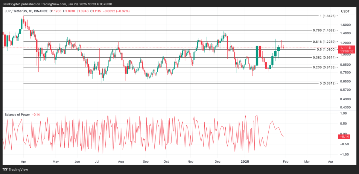 JUP basın saatine göre 1,11 dolardan işlem görüyor ve son 24 saatte %7 düşüş kaydetti. Negatif Güç Dengesi (BoP) -0,14 ile satış baskısındaki artışı teyit ediyor. Bu gösterge, belirli bir dönem içindeki fiyat hareketlerini analiz ederek alıcıların satıcılara karşı gücünü ölçer. BOP negatif olduğunda, satıcılar kontrolü elinde tutarak varlığın fiyatı üzerinde aşağı yönlü baskı uygular ve potansiyel düşüş momentumuna işaret eder. Satıcılar kontrolü ellerinde tutmaya devam ederse, JUP’un fiyatını 1 doların altına çekerek 0,95 dolardan işlem görmesine yol açabilir. Tersine, alıcılar piyasa kontrolünü yeniden ele geçirirse, JUP’un fiyatı 1,22 dolara yükselebilir.