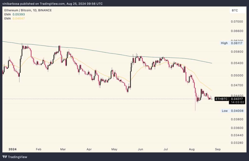 Açıklama zamanında Bitcoin henüz 61.000 ila 62.000 dolar arasındaki “aralık diplerinden” çıkmamıştı. Analist bunun, BTC’nin ATH seviyesine yükselişini doğrulamak için kilit bir seviye olduğunu söylüyor. Jerome Powell’ın Jackson Hole Sempozyumunda yaptığı konuşmanın ardından bu koşul zaten sağlandı. Ardından analist, baskın bir düşüş hissinin Ethereum’u (ETH) Bitcoin karşısında nasıl düşürdüğünü açıklıyor. Ayrıca, ETH/BTC’nin en düşük seviyelere ulaştığını belirtiyor. Ancak bu durumun, altcoin yatırımcılarını ödüllendiren bir altseason başlatabilecek duyarlılık değişimleri nedeniyle değişmesi bekleniyor.
