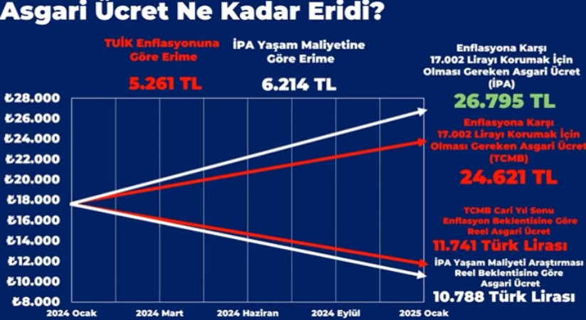 “Ocak ayındaki 17.002 liranın alım gücünü enflasyona karşı korumak için asgari ücretin TCMB verilerine göre 24.621, İPA verilerine göre 26.795 TL olması gerekiyor. Yani asgari ücret bu düzeye ulaşsa bile alım gücü bakımından ancak 2024 Ocak seviyesine ulaşacak. Bu yüzden bu oranı aşan, gelecek senenin enflasyon erimesini de öngören bir artış gerekiyor.”