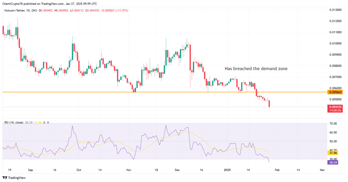 Öte yandan, NOT fiyat hareketi uzun zamandır düşüş eğiliminde. Önemli bir talep seviyesi olan 0.005662’yi kırdıktan sonra bu seviye, artık güçlü bir direnç noktasına dönüştü. Bu durum, toparlanma çabalarını daha da zorlaştırmakta. Ayrıca, Göreceli Güç Endeksi (RSI) basın saatinde 26.24 seviyesindeydi. Bu da, NOT’un aşırı satış bölgesinde olduğunu gösteriyordu.